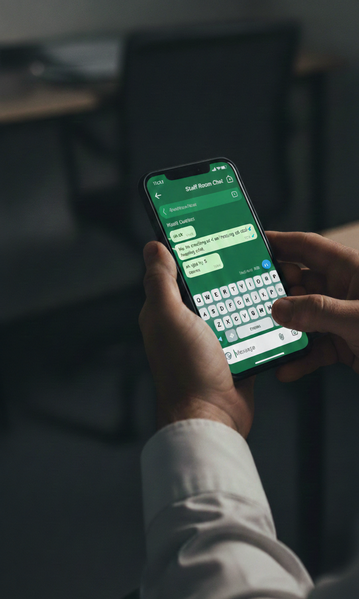 Close-up of a teacher holding a smartphone with a WhatsApp group chat titled 'Staff Room Chat' in a dark room.